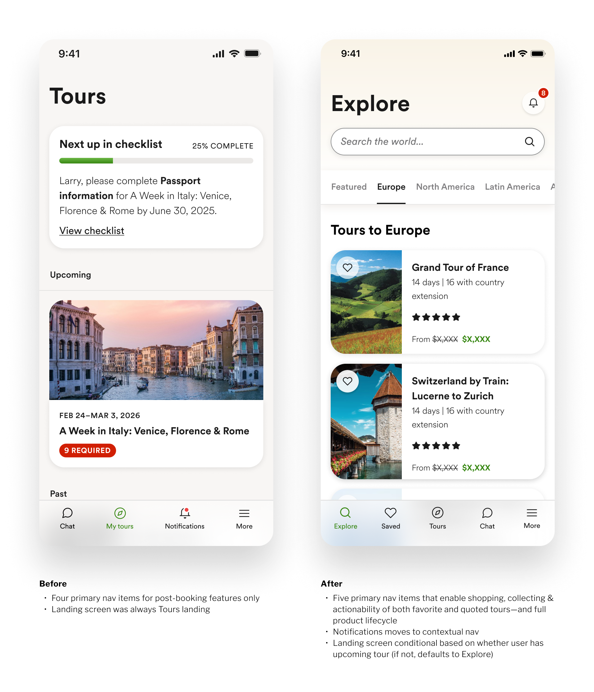 Within Explore, I designed the browsing experience to surface tours, giving travelers a familiar and low-friction way to begin planning their next trip. The UX largely inherited the layout and concepts established in web, just adapted for mobile app behavior.